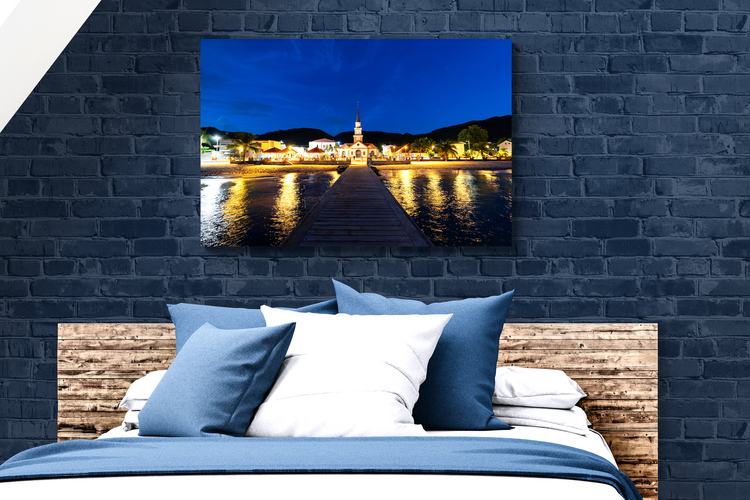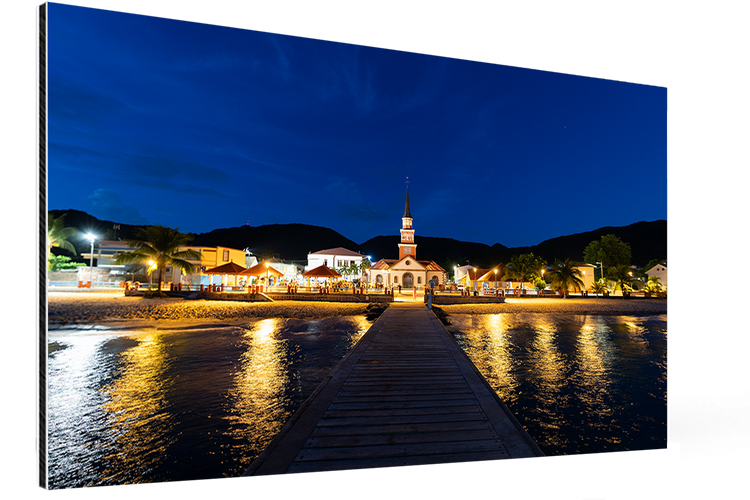 Dans cette photo nocturne de Martinique, l'église des Anses d'Arlet se dresse majestueusement, illuminée par une douce lueur dorée qui contraste avec le bleu profond du ciel à l'heure bleue. Une invitation à plonger dans l'âme de la nuit. Commandez ce tableau pour décorer votre intérieur et apporter une touche magique à votre décoration !